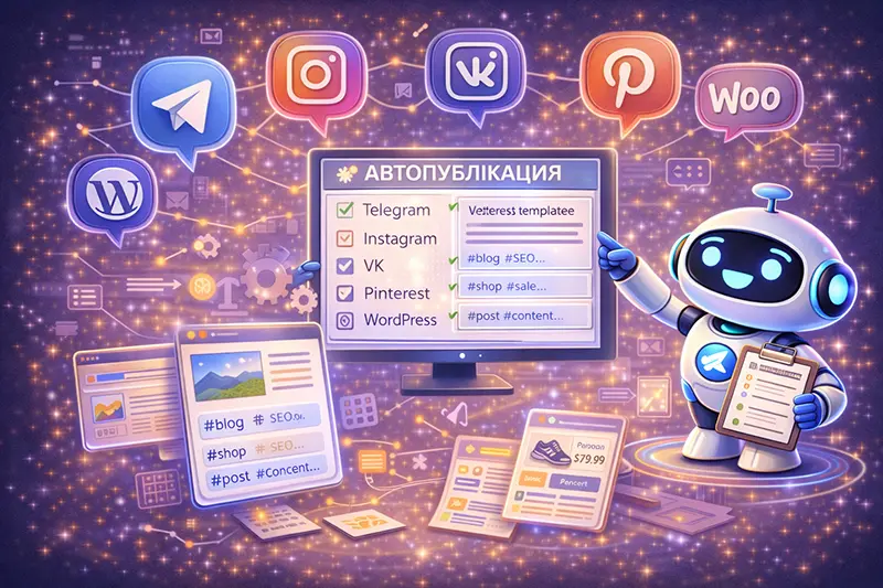 SEO TG Bot позволяет автоматизировать публикации контента на различных платформах, таких как Telegram, Instagram, VK, и Pinterest. С помощью интеграции с WordPress и WooCommerce вы можете публиковать статьи и товары напрямую, без необходимости вручную обновлять каждый канал.